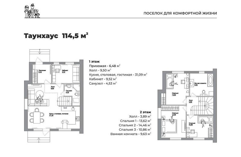 Их три — площадью 90,5 кв. метра, 96 кв. метра и 114,5 кв. метра. На первом этаже расположена просторная кухня, объединенная с обеденной зоной и гостиной, которая станет центральным местом для семейных ужинов и дружеских встреч. Для вашего удобства на 1 этаже также находится туалетная комната и прачечная.