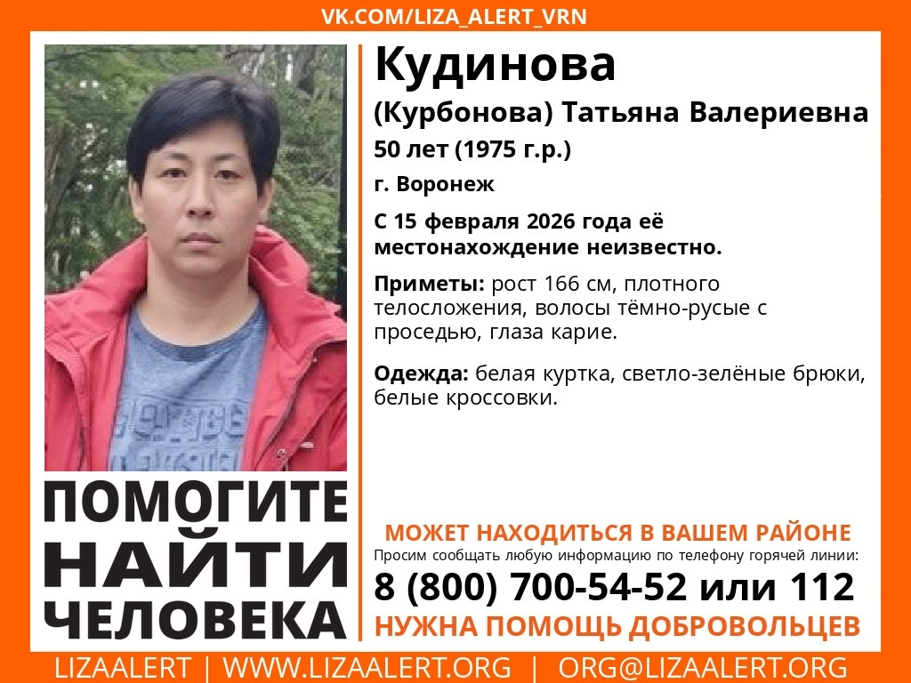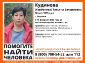 В Сети опубликована ориентировка на пропавшую без вести 50-летнюю жительницу Воронежа Татьяну Кудинову (в девичестве Курбонову). Она исчезла еще 15 февраля, то есть больше двух недель назад, и с тех пор о местонахождении женщины никто ничего не знает. В ориентировке указано, как внешне выглядит Татьяна Кудинова, а также, во что она была одета в момент пропажи.