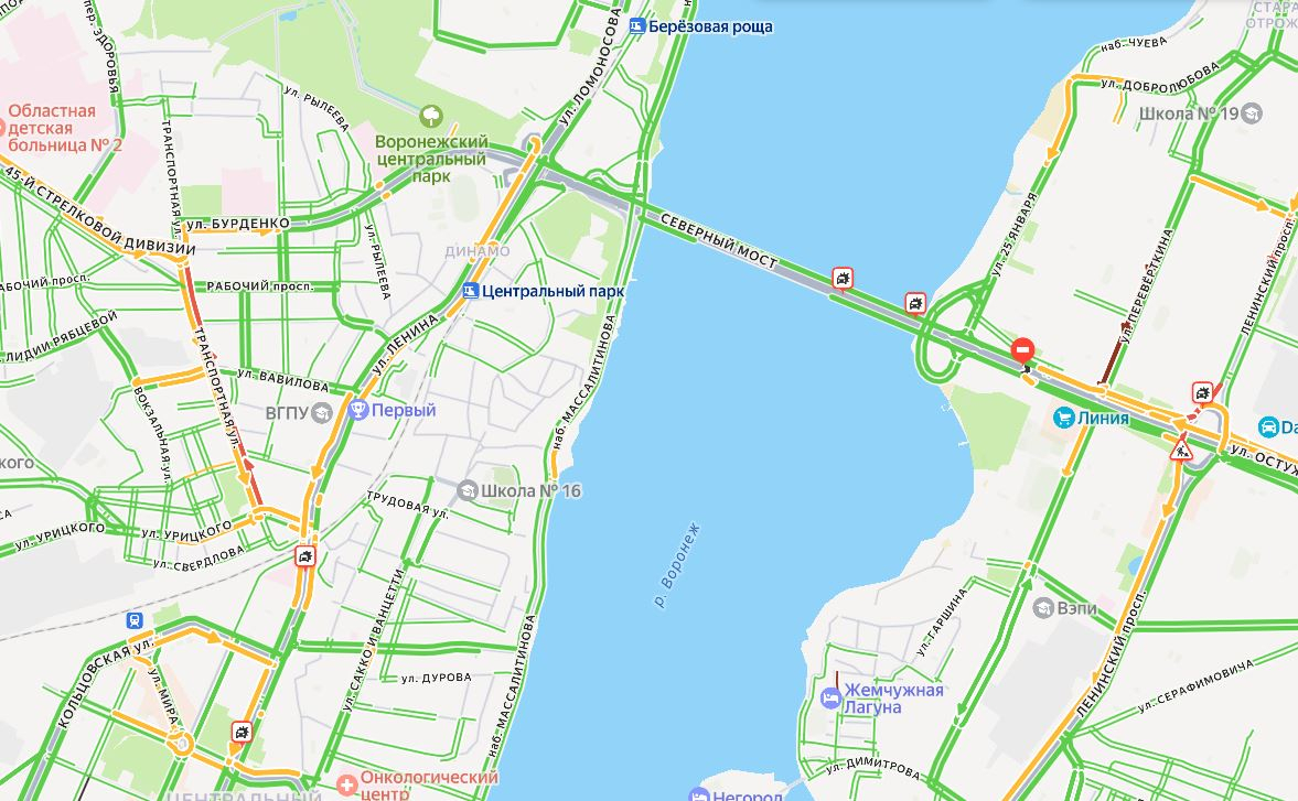 Также «Яндекс. Карты» показывают, что есть аварии в непосредственной близости от места затора – две на проспекте Революции и еще две – прямо на Северном мосту.