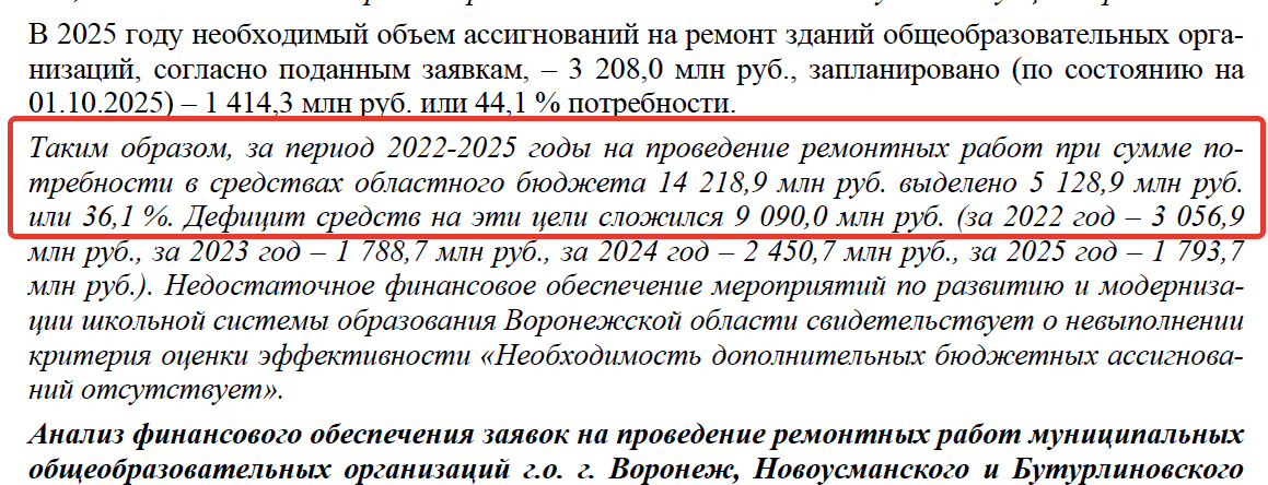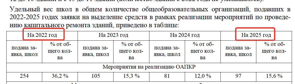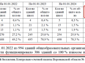 Отсутствуют школы со 100-процентным износом зданий только в пяти муниципалитетах – в городских округах Борисоглебск и Нововоронеж, а также в Верхнехавском, Хохольском и Эртильском районах. А вот в Нижнедевицком и Ольховатском районах все здания школ (9 и 14 соответственно) имеют 100-процентный износ.При этом в КСП отмечают удивительную ситуацию – сокращение (почти в 2 раза за четыре года) количества заявок на выделение бюджетных денег для проведение капитального ремонта общеобразовательных учреждений: если в 2022-м было подано 254 заявки, то в прошлом году – 97. И очевидно, что не все из них были выполнены.