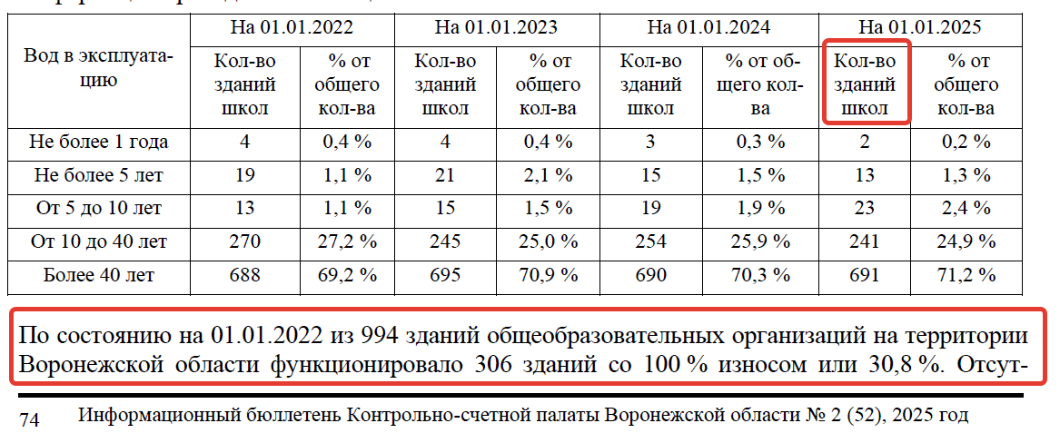 Каждое третье здание школы Воронежской области сегодня имеет 100-процентный износ, а таковых насчитывается 308 объектов. При этом в целом в регионе имеется 970 зданий общеобразовательных организаций. И с каждым годом эти объекты стареют: в категории «более 40 лет» насчитывается 691 здание воронежских школ, что уже превышает 70 процентов. Такие данные представлены в опубликованных материалах региональной Контрольно-счетной палаты.