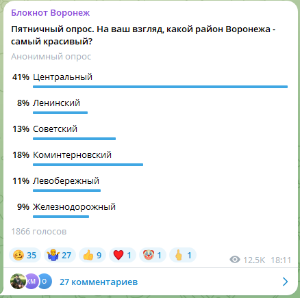 «Блокнот Воронеж» решил спросить у подписчиков в telegram-канале, какой район города они считают самым красивым. В опросе приняли участие более 12 тыс человек.