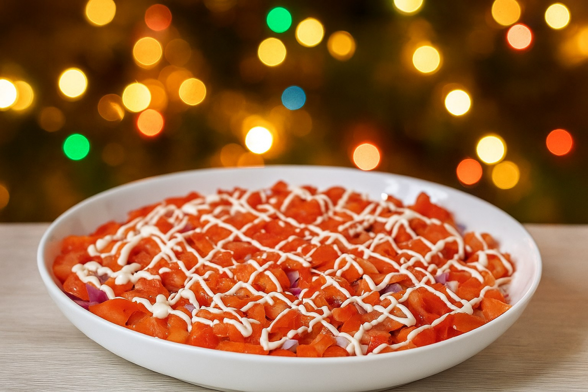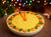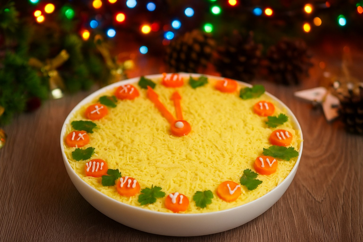Идея в виде циферблата символизирует последние мгновения уходящего года и радостное ожидание нового счастья. Сочетание нежного куриного филе, свежих овощей и крабовых палочек делает его по-настоящему праздничным.