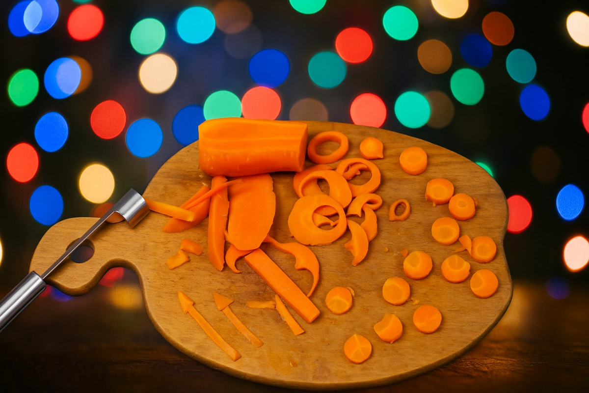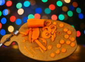 Твердый сыр натрите на средней или мелкой терке. Щедро посыпьте им салат, создавая последний, ровный и плотный слой. Теперь подготовим украшение. Морковь отварите до мягкости (20-25 минут), остудите и очистите. Нарежьте ее поперек кружочками толщиной около 5 мм. С помощью маленькой трубочки или ножа для карвинга вырежьте из кружочков небольшие колечки. Вам понадобится 12 колечек для цифр и 1 для центра циферблата. Также вырежьте две стрелки – покороче (часовая) и подлиннее (минутная).
