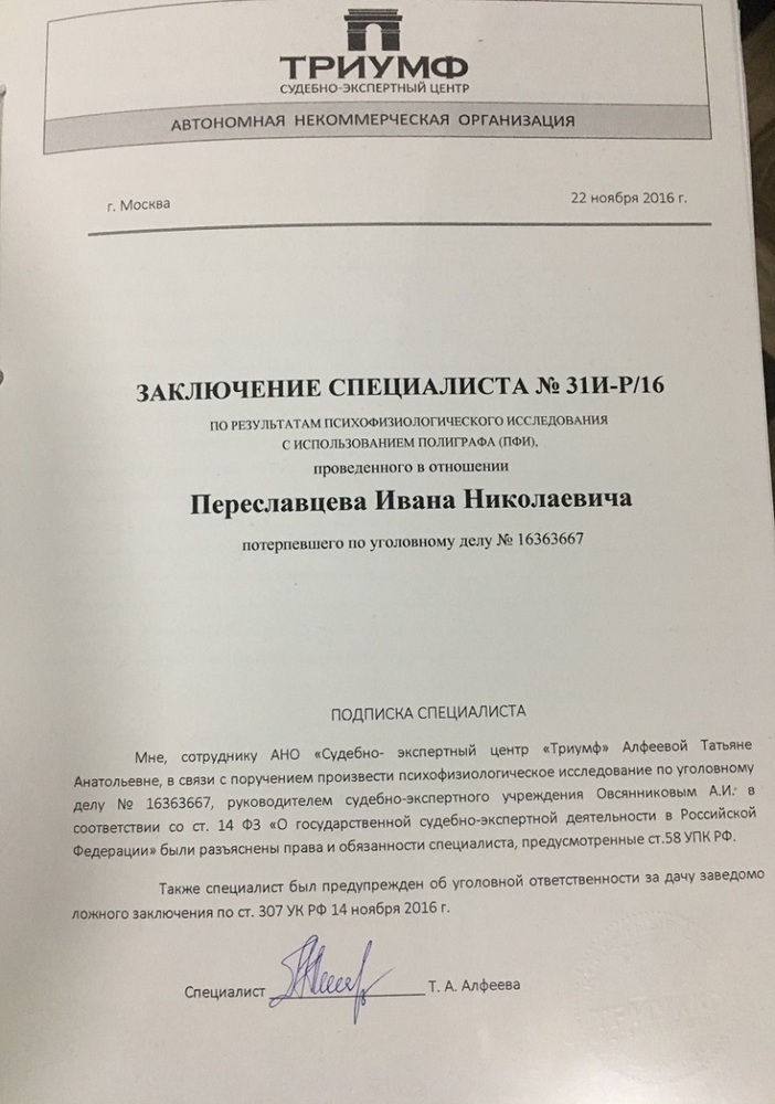 В ноябре 2016 года Иван Переславцев прошел испытание в московском АНО "Судебно-экспертный центр "Триумф" у сертифицированного специалиста Татьяны Алфеевой, которая работает в этой сфере 9 лет и готовит заключения для судебных процессов и следственных органов.