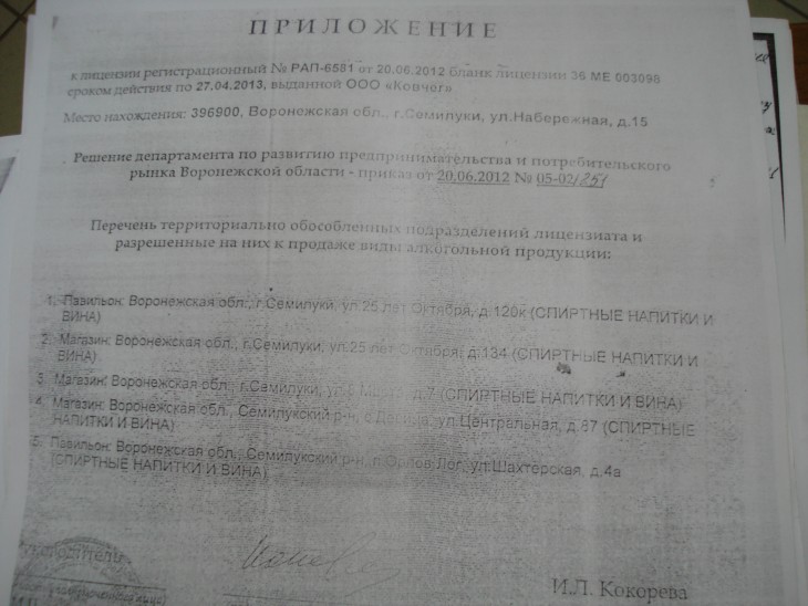 Согласно федеральному законодательству, продажа спиртных напитков на остановках движения общественного транспорта запрещена. Однако в июне прошлого года руководитель департамента по развитию предпринимательства и потребительского рынка Воронежской области Ирина Кокорева выдала лицензию обществу с ограниченной ответственностью «Ковчег» на розничную продажу алкогольной продукции. В документе указан адрес — улица 25 лет Октября, дом 120к. Как же так получается: уроженка Семилук, в прошлом замглавы района (а ныне глава) не знает, что выдает лицензию на торговлю спиртным на остановке, тем самым грубо нарушает федеральное законодательство? Или все-таки Ирина Кокорева предпочла сделать вид, что ей ничего неизвестно?