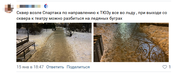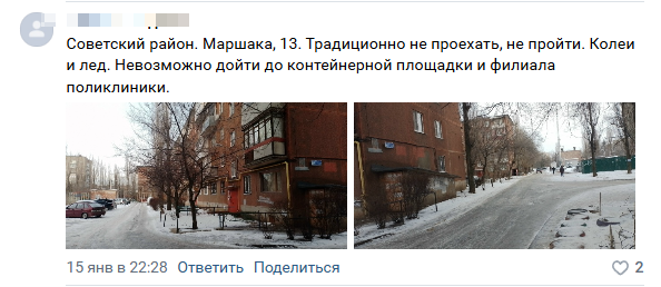 Ранее мэр города просил воронежцев делиться «ВКонтакте» конкретными адресами «заледенелых» мест, чтобы службы более оперативно приводили их в порядок, жалобы передали районным комбинатам благоустройства, специалисты которых направили свои силы туда. Для этого есть необходимая техника и ресурсы (машины, дворники). И воронежцы активно поделились адресами.