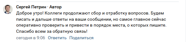 «Коллеги продолжают сбор и отработку вопросов. Будем писать и дальше ответы на ваши сообщении, но самое главное сейчас оперативно проверить и привести в порядок места, о которых пишите. Спасибо всем за обратную связь», – отметил сегодня Петрин в Сети.