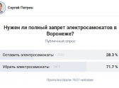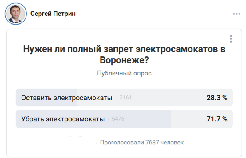 28 июля на планерке в городской администрации мэр Воронежа Сергей Петрин поручил управлению транспорта изучить общественное мнение на счет запрета электросамокатов. Уже к вечеру того же дня соответствующий опрос появился на странице «ВКонтакте» самого градоначальника.