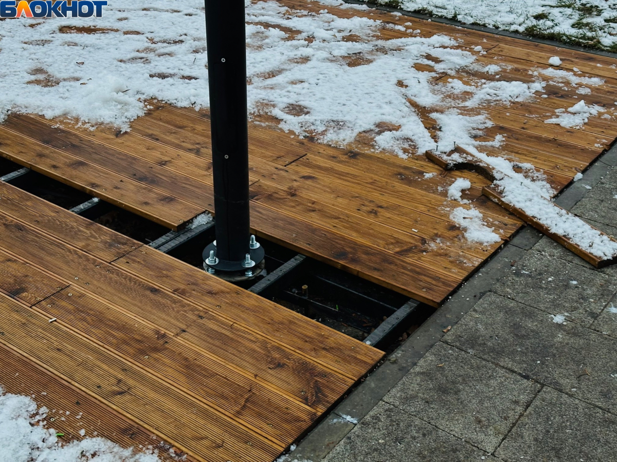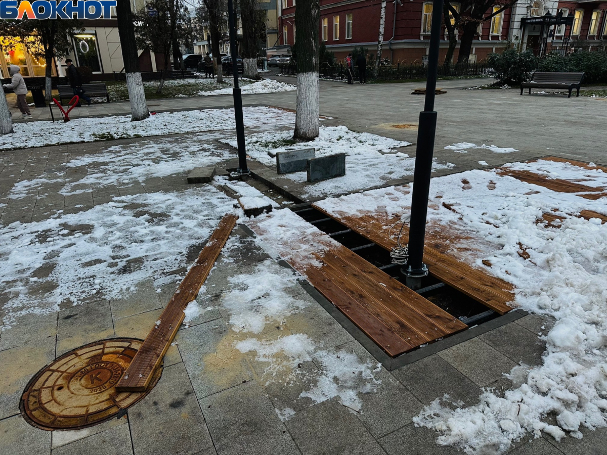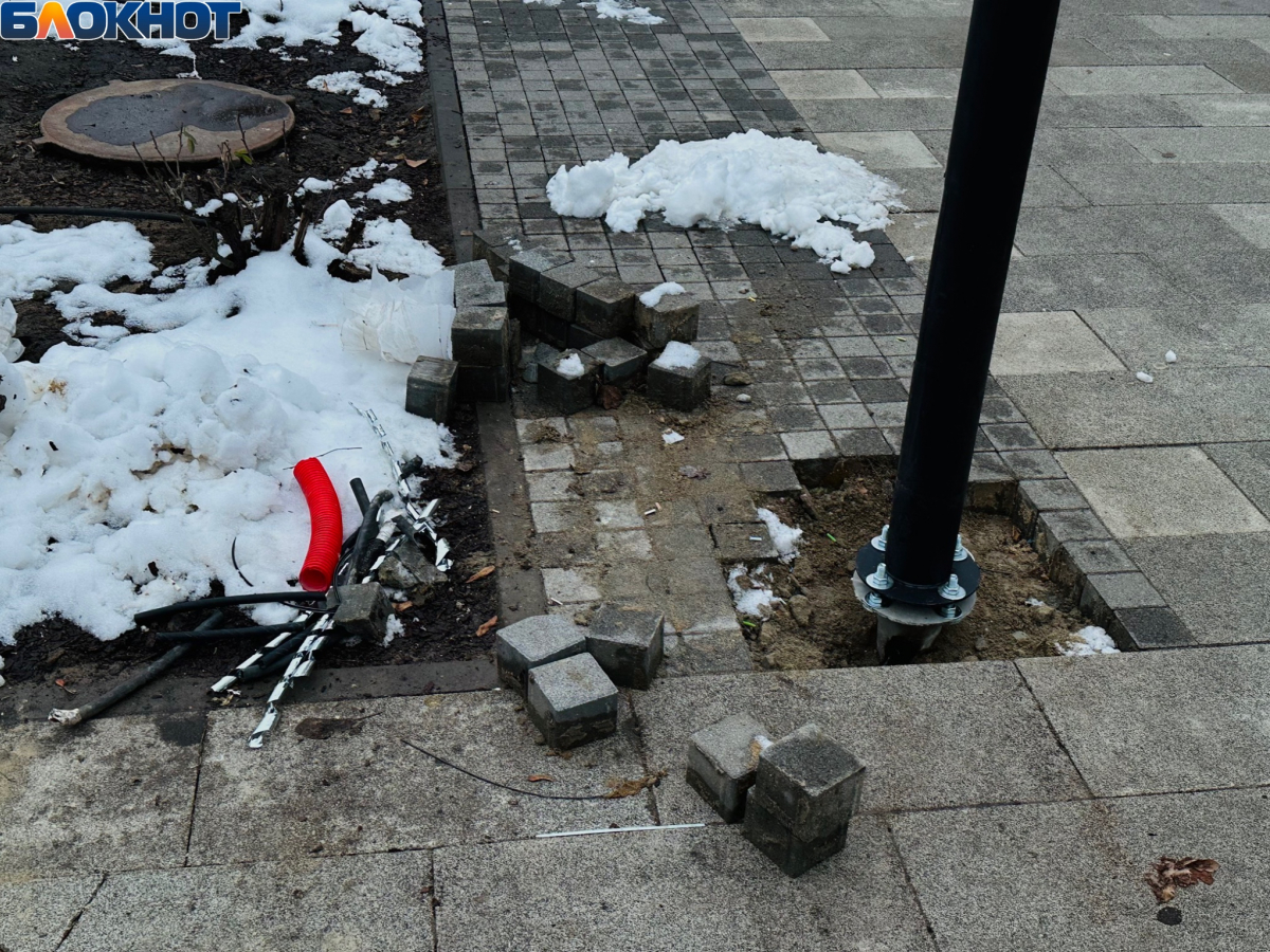 Сейчас этот отрезок бульвара представляет собой активную строительную площадку. В ходе работ, как удалось зафиксировать нашему фотокорреспонденту, вскрыта часть деревянного настила. По предварительной информации, это связано с необходимостью монтажа или ремонта подземной электропроводки, которая питает уличные фонари.