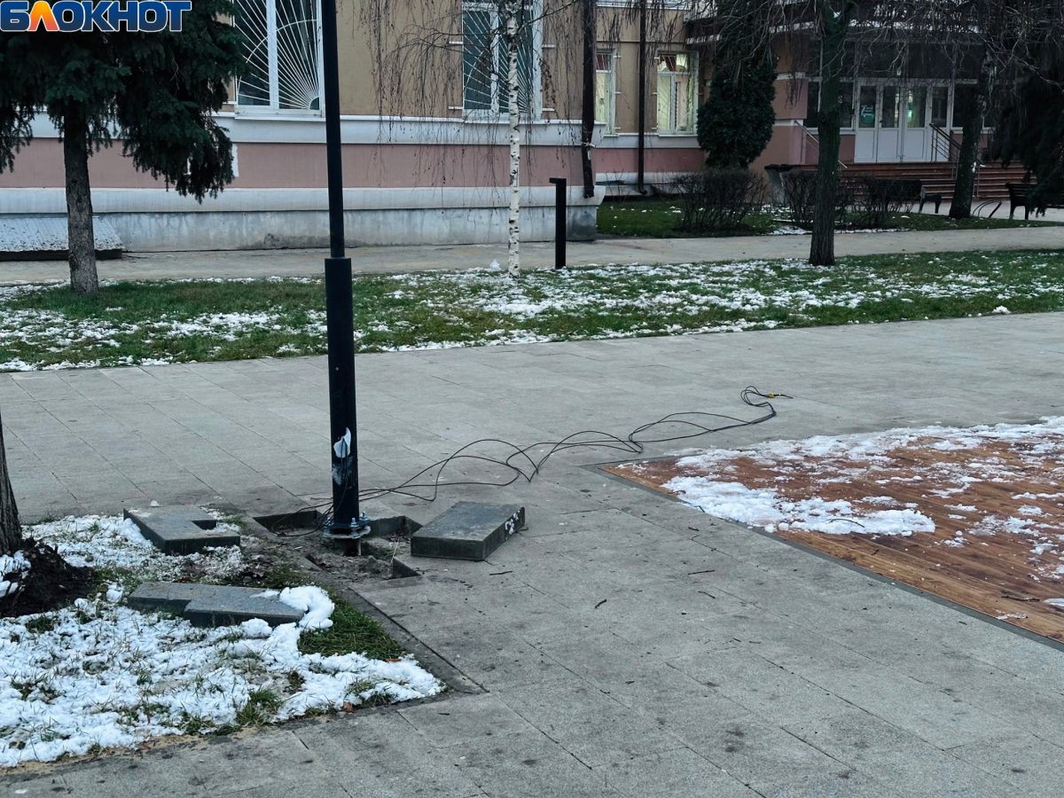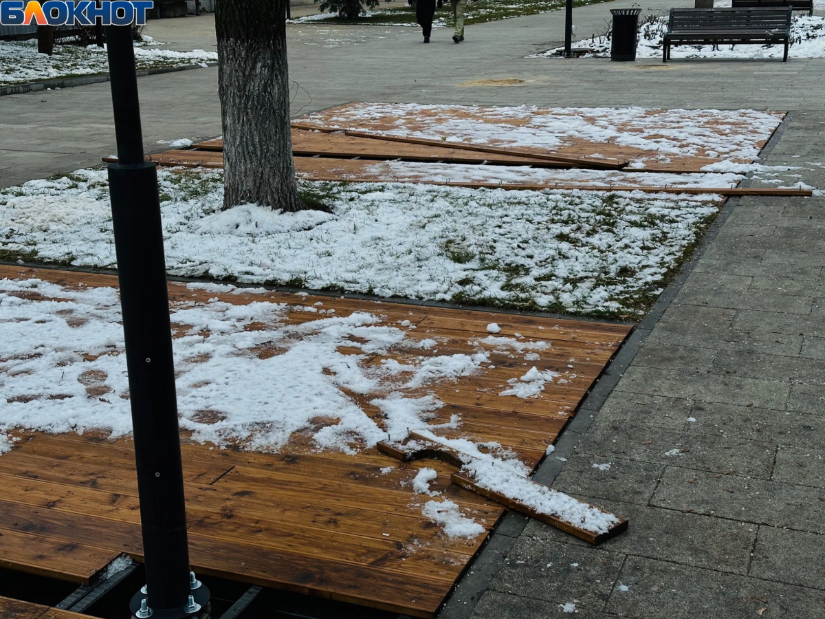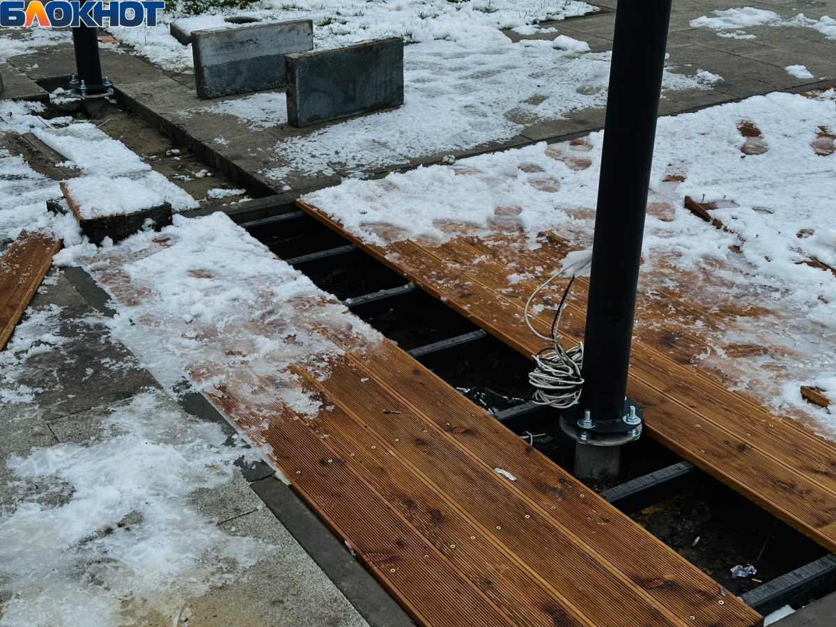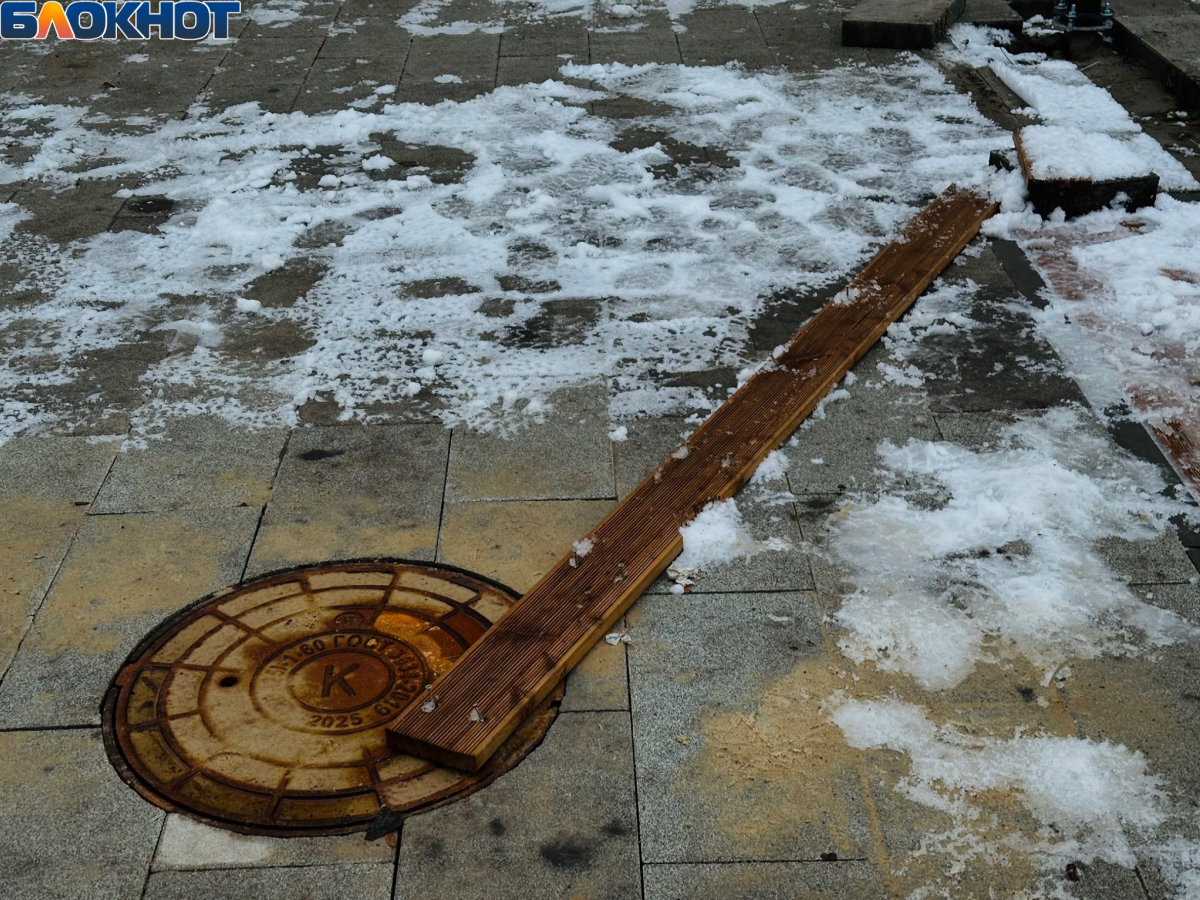 Сейчас этот отрезок бульвара представляет собой активную строительную площадку. В ходе работ, как удалось зафиксировать нашему фотокорреспонденту, вскрыта часть деревянного настила. По предварительной информации, это связано с необходимостью монтажа или ремонта подземной электропроводки, которая питает уличные фонари.
