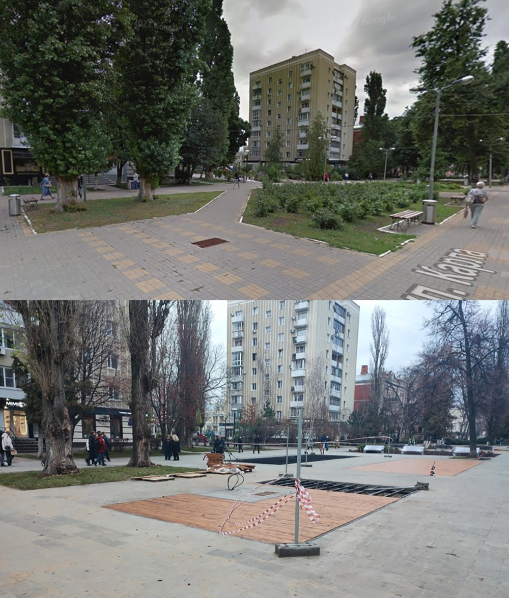 "Благоустройство" – это вторая провальная сфера. Здесь также ничего не меняется к лучшему. Ремонт общественных пространств у нас уже давно делается по старой надежной схеме: Ценные объекты территории (зеленые насаждения, исторические объекты и т.д.) меняются на плохо уложенную, светлую, маркую плитку и неудобные лавки.