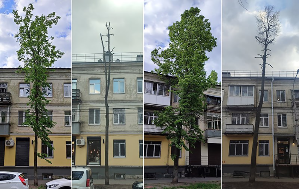 Никуда не делась и варварская обрезка, происходящая за бюджетный счет. Вот примеры в самом центре города на улице Таранченко, где пострадали большие липы, теперь они, вероятно, засохнут.