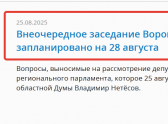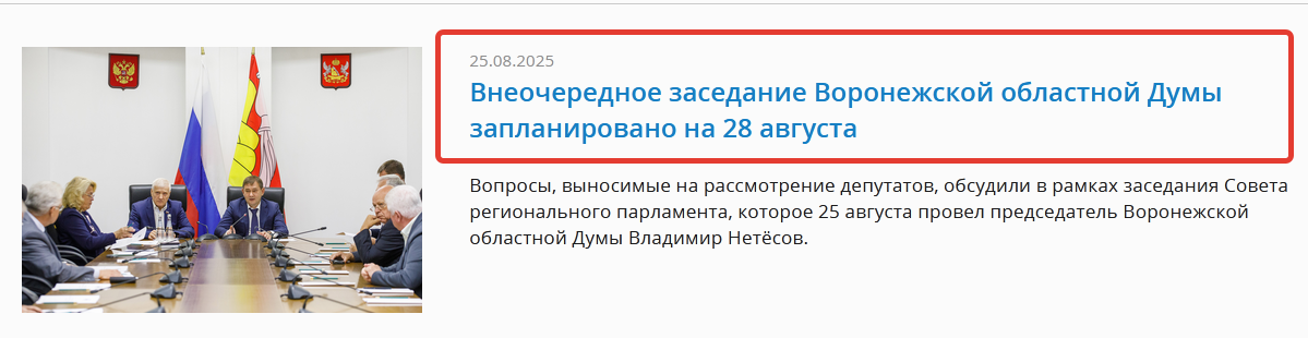 Это неожиданное мероприятие будет проводиться при странном формате. Ведь всего шесть недель назад, 10 июля 2025 года, состоялось последнее, 58-е заседание, Воронежской областной Думы. Причем немалая часть этого мероприятия прошла фактически в закрытом режиме, трансляция заседания была прервана и чем депутаты занимались полтора часа в парламентском центре – неизвестно. Позже на сайте областной думы появилось сообщение – «58-е заседание Воронежской облдумы стало завершающим в седьмом созыве».