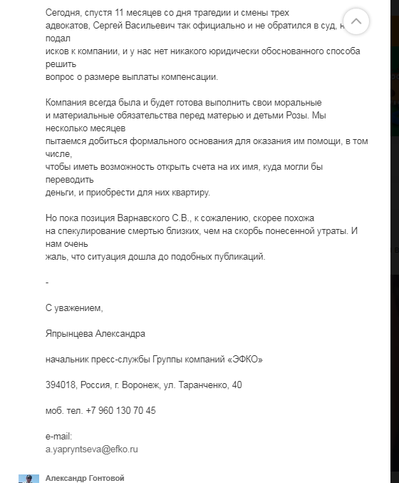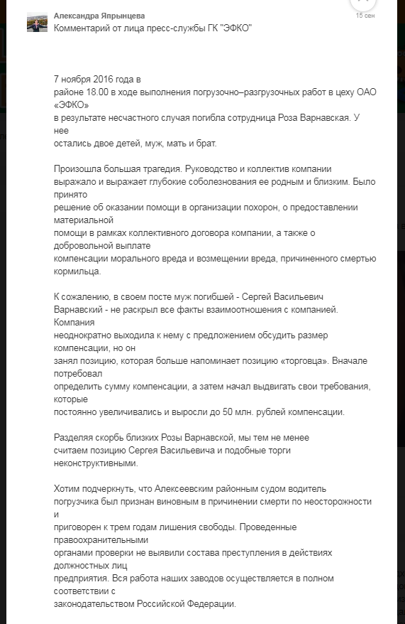 Да, говоря о позиции Сергея Варнавского, в ЭФКО не дали название собственной позиции. Между тем дело выглядит так, что компания просто не дала убитому горем отцу и мужу по-человечески расстаться со своей болью. А наоборот - обострила конфликт, выгораживая ценных сотрудников. Хотя даже матпомощь и наказание виновных вкупе никак не могут засчитываться в заслугу ЭФКО, это - долг ответственной компании. Но бизнесмены решили по-другому.