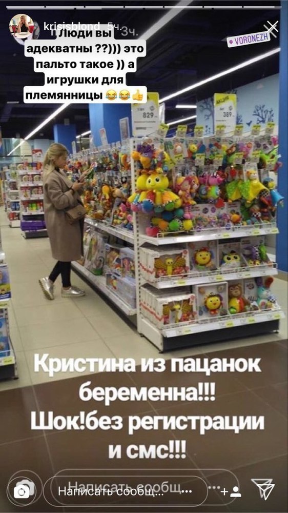Экс-участница шоу «Пацанки» Кристина Белокопытова прокомментировала распространяемые в интернете слухи о своей беременности. Они появились, после того как девушка сфотографировалась в магазине игрушек, при этом у нее топорщился живот.