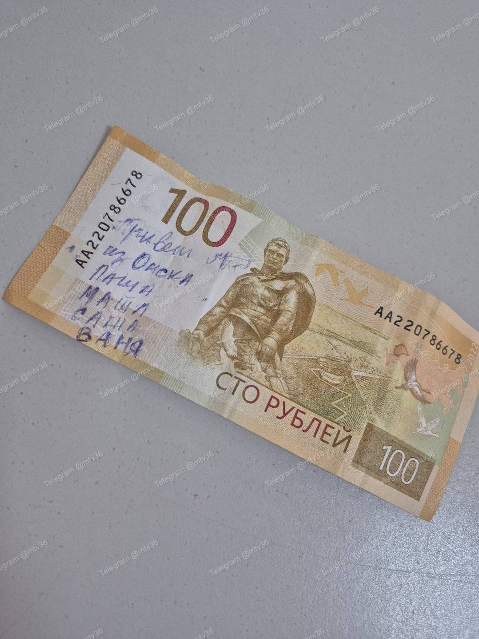 На банкноте ручкой написано: «Привет из Омска от Паши, Маши, Саши и Вани».