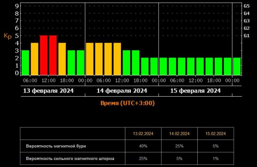 Отметим, что ещё одну магнитную бурю прогнозируют на завтра, 14 февраля. Но она будет слабее сегодняшней по силе. Она продлится с полуночи до 12:00 Дня всех влюблённых.