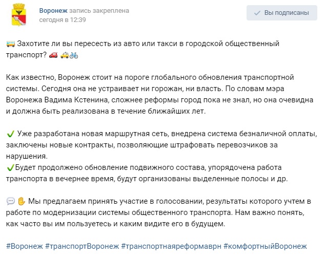 Чиновники мэрии Воронежа организовали опрос в соцсети «ВКонтакте», в котором решили узнать об отношении воронежцев к общественному транспорту. Как говорят в администрации, сейчас он стоит «на пороге глобального обновления транспортной системы».