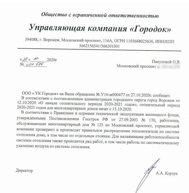 Ольга прислала копию ответа из УК «Городок». В документе сказано, что коммунальщики распределяют теплоноситель и проводят удаление воздуха из системы.