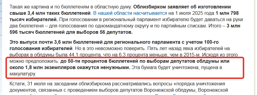 Как пояснил тогда «Блокнот», в нашей области насчитывается на 1 июля 2025 года 1 млн 798 тысяч избирателей. Каждому для голосования в региональный парламент (на территории всей области) предполагалось выдавать на руки два бюллетеня – для голосования по одномандатному округу и по партийным спискам. Итого – потребовалось около 3 млн 596 тысяч бюллетеней для выборов 56 депутатов Воронежской облдумы. Хотя облизбирком заявил о планируемом изготовлении несколько иную цифру – «свыше 3,4 млн бюллетеней».