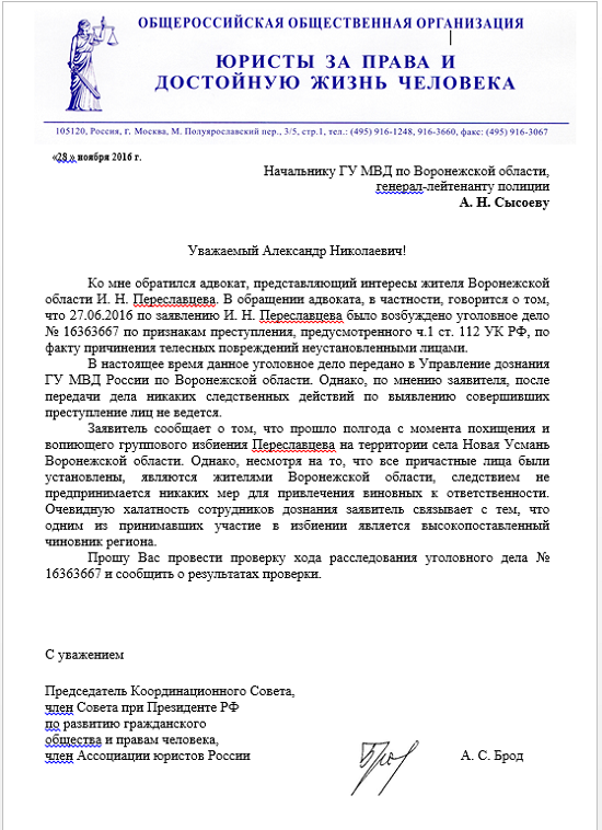 Делом таксиста Ивана Переславцева, который заявил о зверском избиении в мае 2016 года в селе Новая Усмань Воронежской области, занялся член Совета при президенте России по правам человека и развитию гражданского общества Александр Брод. Правозащитник отправил запросы областному прокурору Николаю Шишкину и главе управления МВД по Воронежской области Александру Сысоеву, чтобы силовые ведомства провели проверку в связи с вероятным давлением на следствие.