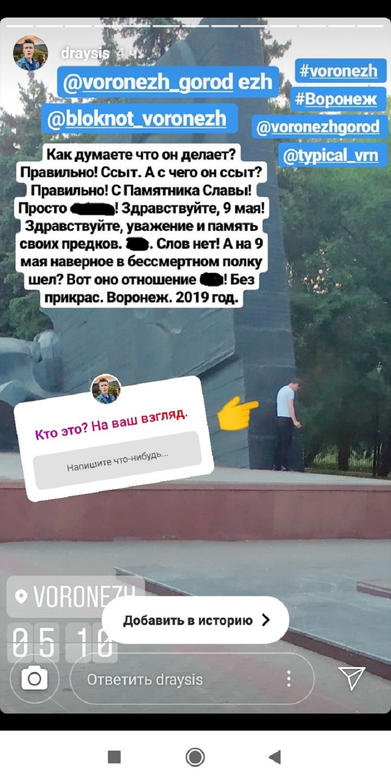 22 мая в 5:10 утра молодой человек сделал фотографию, на которой видно, как житель города, не обращая внимания на прохожих, стоял на мемориальном комплексе, братской могиле воинов Советской Армии, и справлял нужду. Судя по всему, его абсолютно не волновало, что именно в этом месте захоронено 10 тысяч человек, погибших в боях за Воронеж во время Великой Отечественной войны в 1942-1943 годах.
