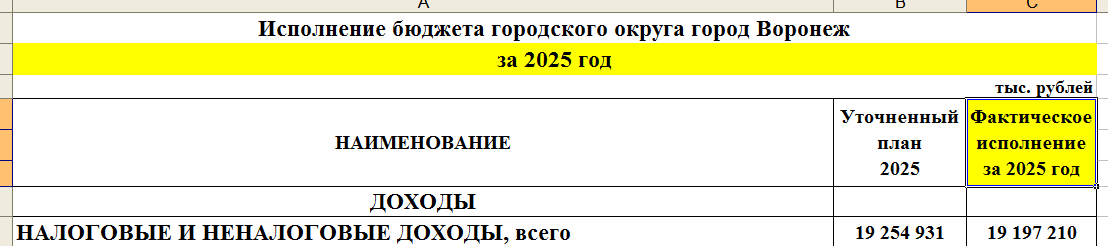 скриншот из документа мэрии Воронежа, основные показатели по исполнению городского бюджета в 2025 году