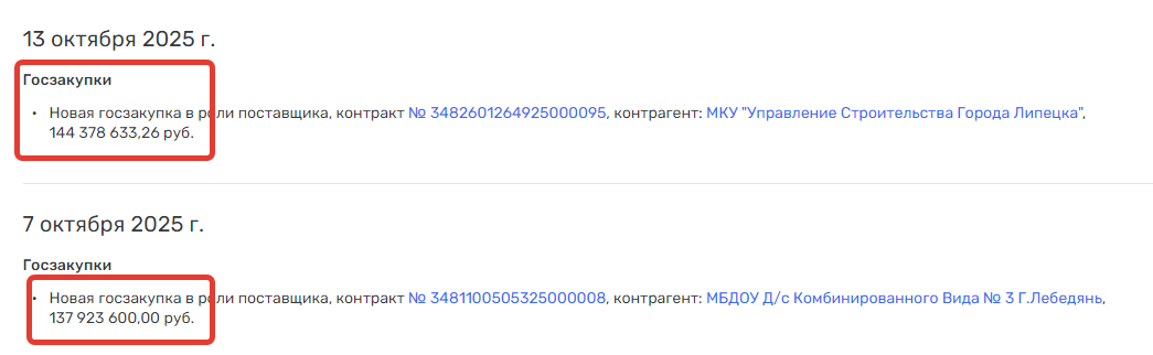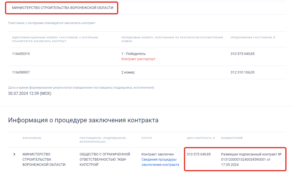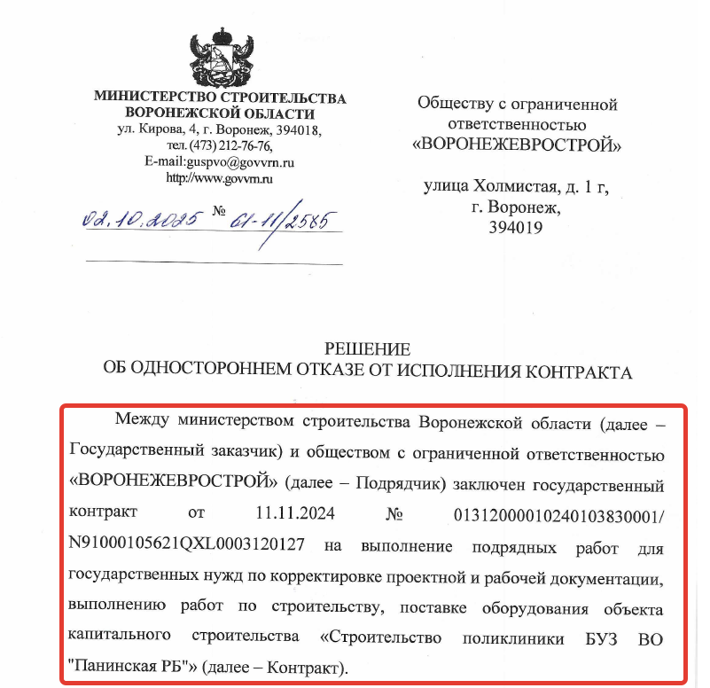Что же касается истории с первым подрядчиком на строке поликлиники в Панино, то им было ООО «ЖБИ-Капстрой». Контракт на 310 млн рублей был заключен в мае 2024 года, а уже в июле, то есть через два месяца, - расторгнут со стороны подрядчика.