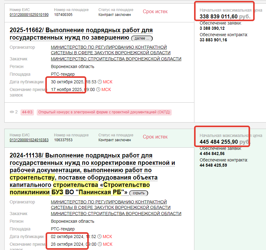 скриншот сайта госзакупок, информация о проведении двух торгов по строительству поликлиники в Панино