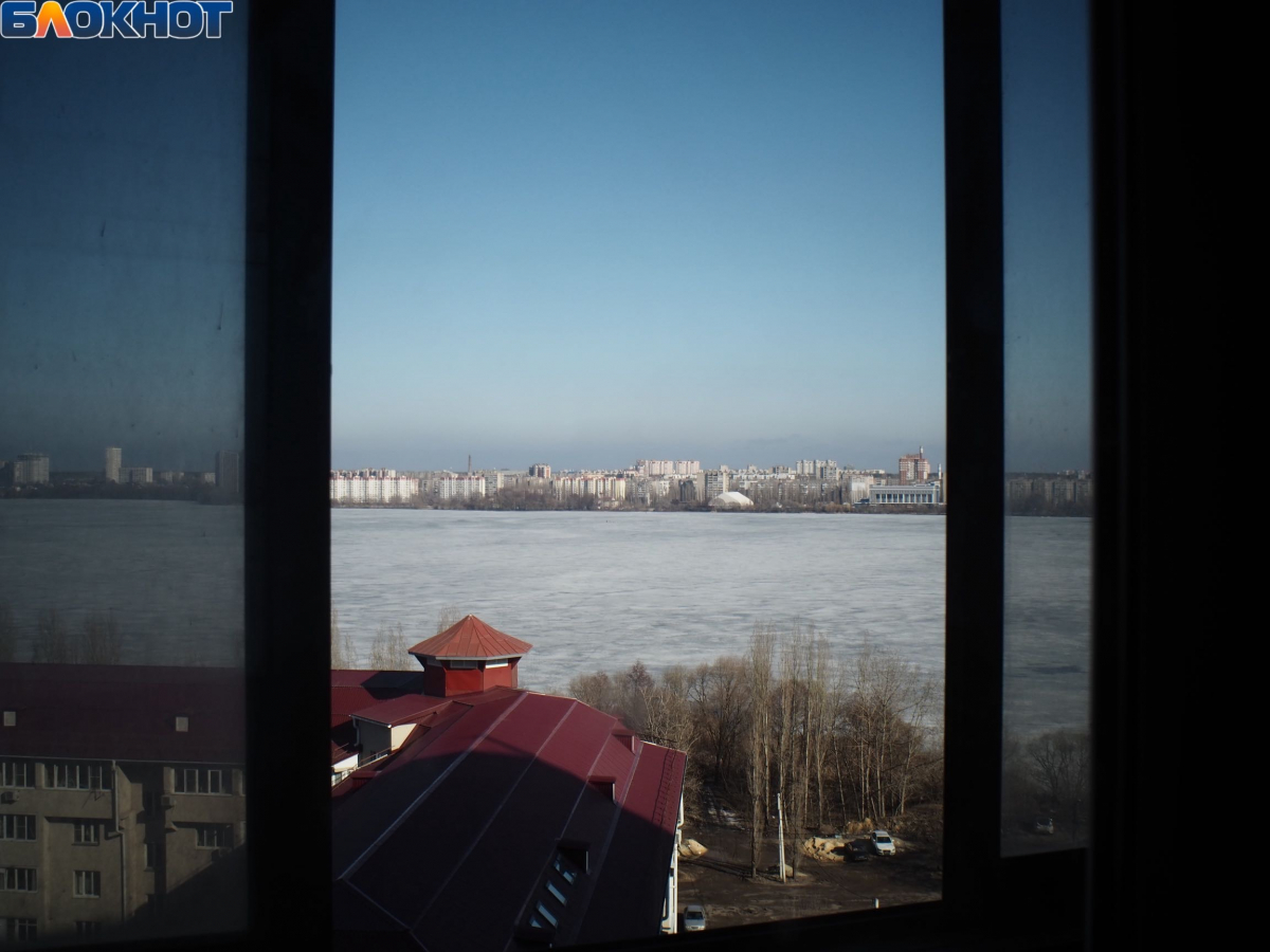 Воронежское водохранилище, еще скованное льдом, уже поменяло цвет: вместо матово-белого панциря - прозрачно-синеватая корка, местами проступает темная вода у промоин.