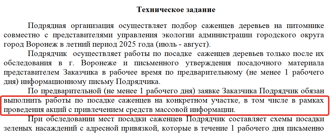 В техзадании говорится, что после посадок, уже в 2026 – 2027 годах, уходные работы за саженцами деревьев должны проводиться с актированием выполненных работ, фотофиксацией и фиксацией системой ГЛОНАСС по факту каждого мероприятия.