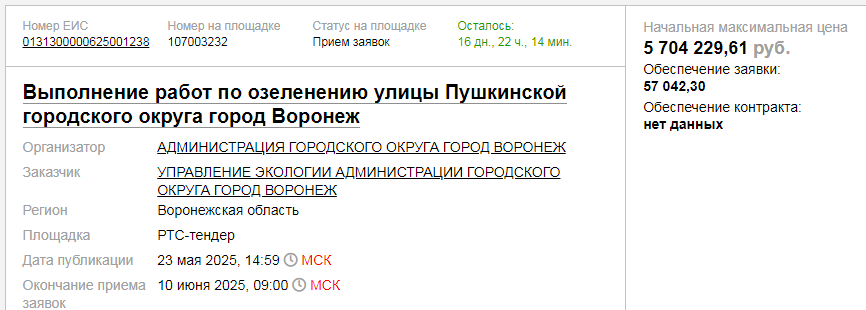 Максимальная цена контракта - 5,7 млн рублей. В нее входят не только приобретение почти 300 растений, но и их посадки и уход за ними до осени 2027 года.