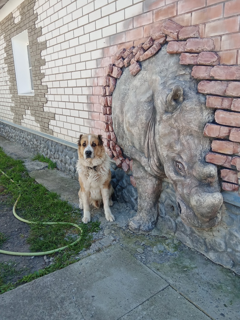 В каменную стену дома села Латное вломился носорог. Кирпичи буквально треснули и грозили посыпаться, а пес был повергнут в шок. Не верите? Так оно и есть. Вот только маленький нюанс – это просто сюжет, который создал на стене дома местный житель. Андрей Андросов создает фигуры из арт-бетона уже 10 лет.