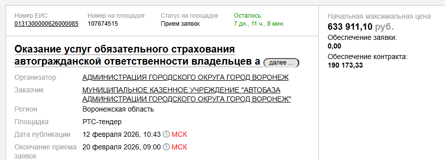 скриншот сайта госзакупок, проект муниципального контракта на оказание услуг ОСАГО для техники МКУ «Автобаза администрации городского округа город Воронеж» в 2026 году и до 1 марта 2027 года. Китайских внедорожников Haval H9, фургона Sollers Atlant и трактор Belarus 82.1 не было в прошлогоднем контракте. Стоит иметь в виду, что помимо транспортных средств из списка у городских властей могут быть еще много именно легковых машин в их различных муниципальных учреждениях, организациях, предприятиях.