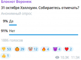 В связи с такой датой (ну и возобновлением дискуссий) мы решили провести опрос среди своих подписчиков в Telegram и посмотреть, какой процент людей у нас празднует Хэллоуин. Среди нашей аудитории 9% заявили, что намерены сегодня отмечать и 91% отказывается от празднования Дня всех святых. Всего в опросе приняло участие 1884 жителя области, то есть, празднующих из них – 168.