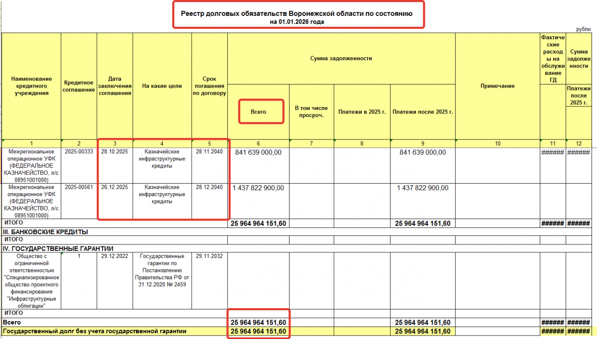 Минфин Воронежской области опубликовал данные о размере госдолга региона на 1 января 2026 года. Показатель составляет 25 млрд 965 млн рублей и по сравнению с аналогичной датой предыдущего года сократился почти на 2,5 млрд рублей.