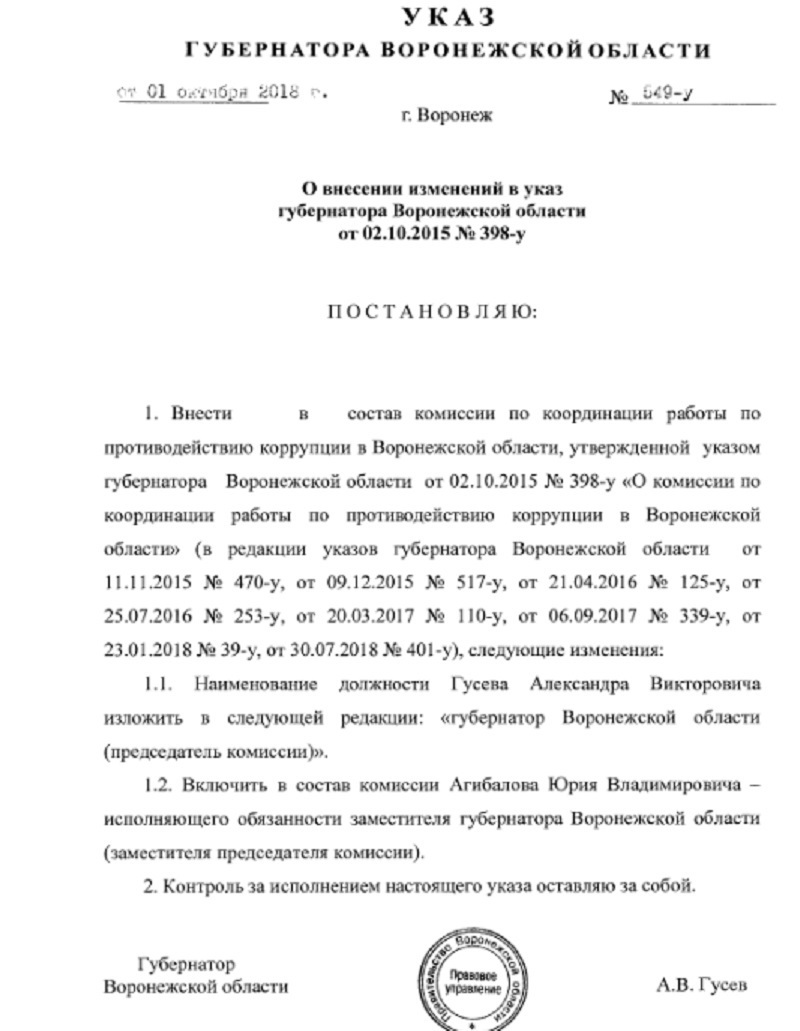 Ровно сутки боролся с коррупцией в Воронежской области вице-губернатор Юрий Агибалов. 1 октября, в разгар скандала с «золотым парашютом», губернатор Александр Гусев назначил своего зама в состав комиссии по координации работы по противодействию коррупции в Воронежской области. А уже 2 октября на официальном портале регионального правительства появился указ Александра Гусева, которым он отменяет назначение Юрия Агибалова в комиссию.