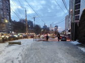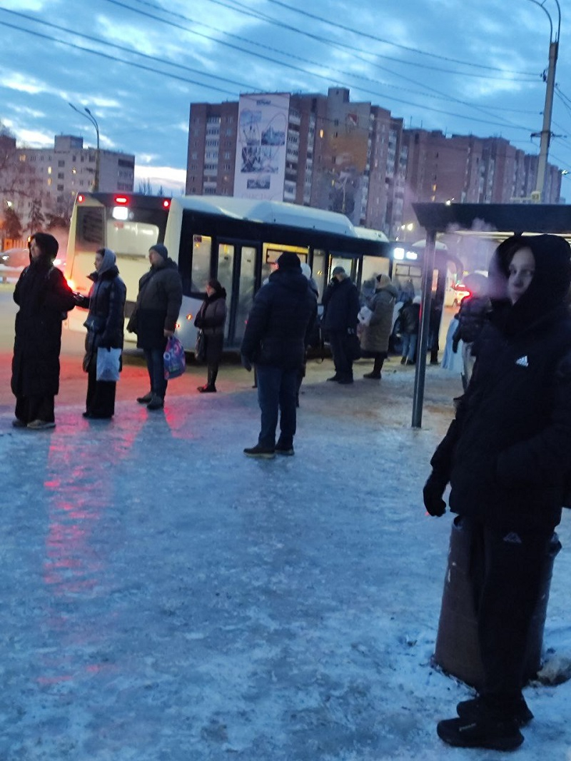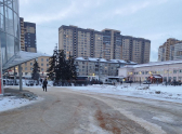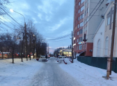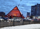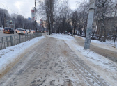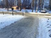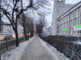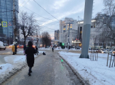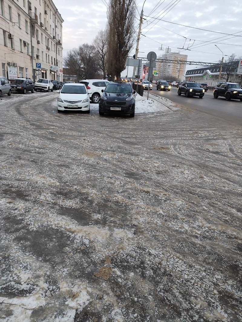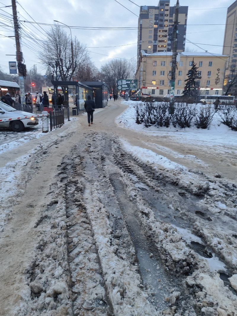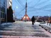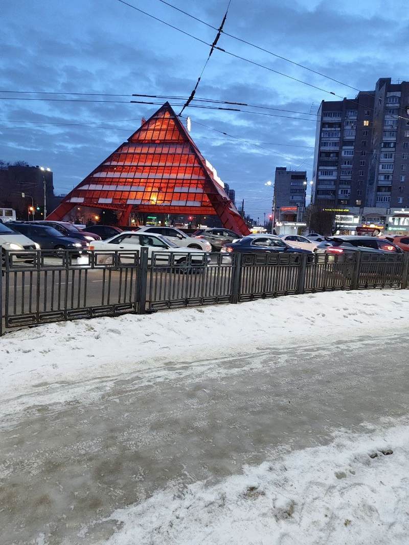 Это пирамидка у Памятника Славы, ее окрестности и остановка. Все укатано в лед, посыпки на момент съемки нет. В этой зоне передвижение на коньках видится даже не шуткой, а реальной возможностью – почему нет?