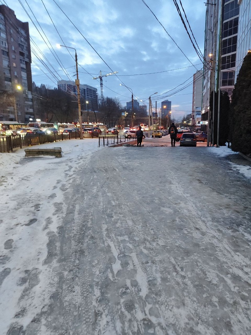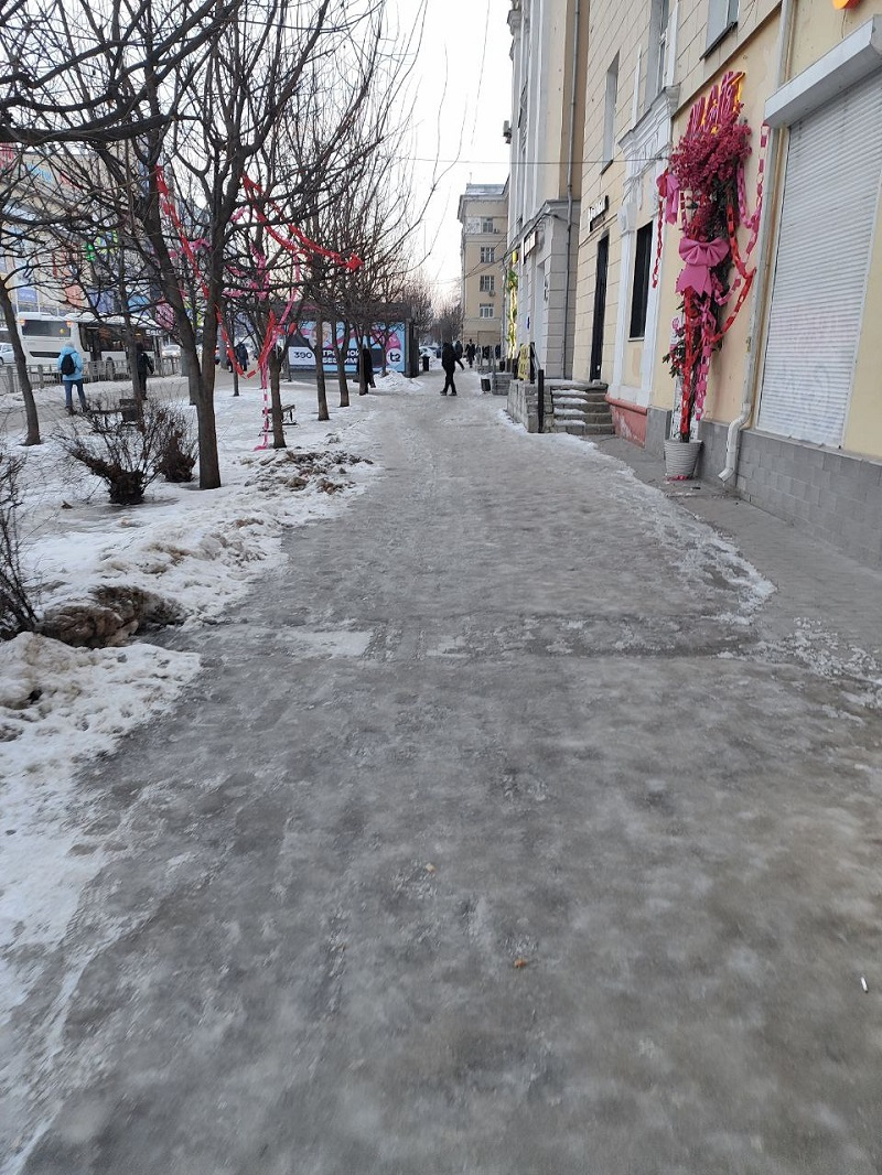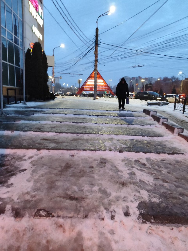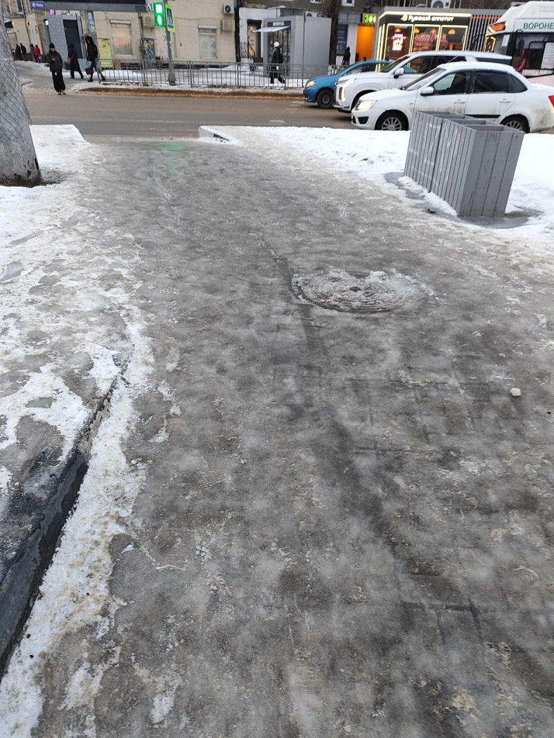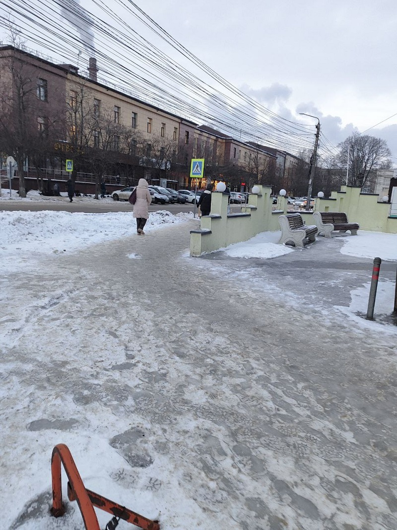 Особенно скользко у спуска в подземный пешеходник. Выглядит безобидно, но это идеально полированная ледяная поверхность.