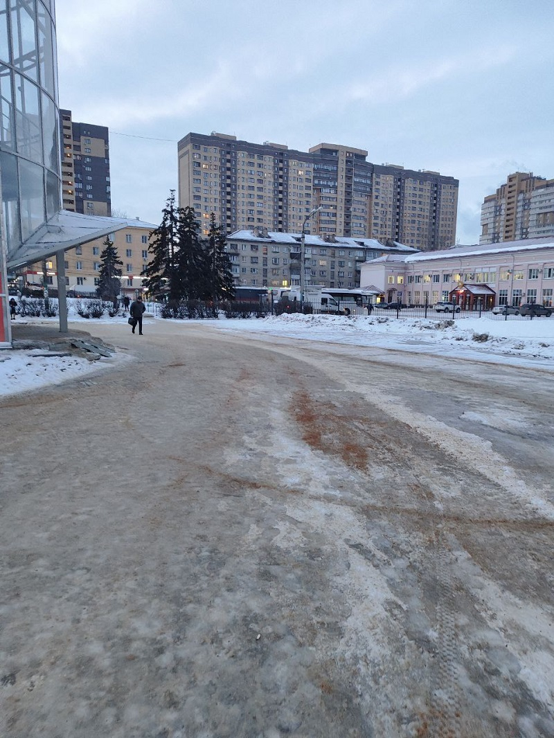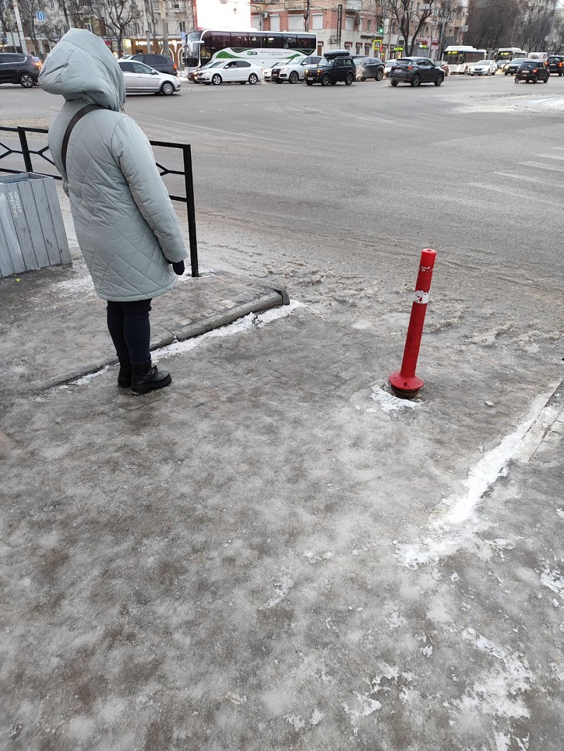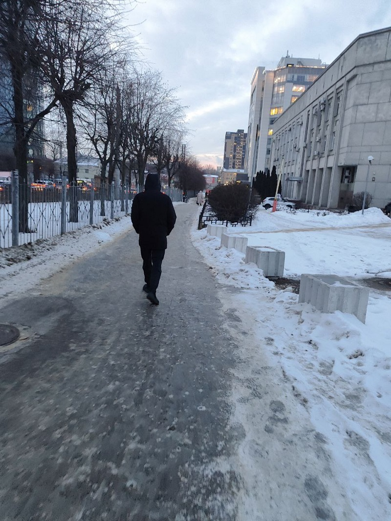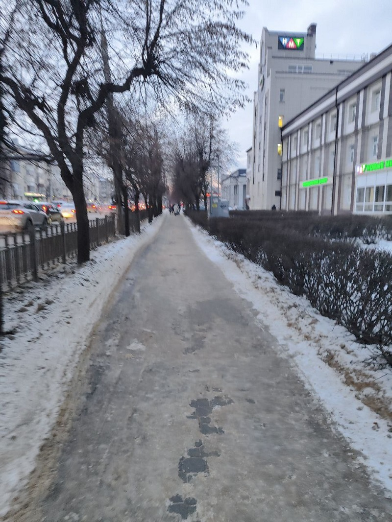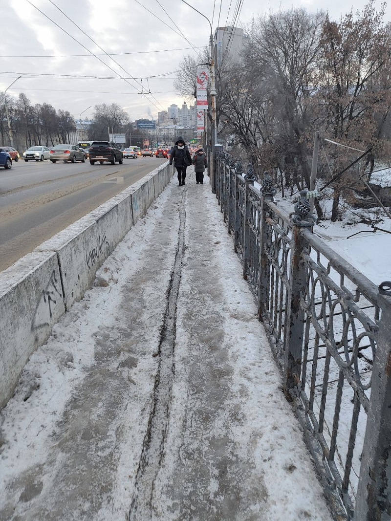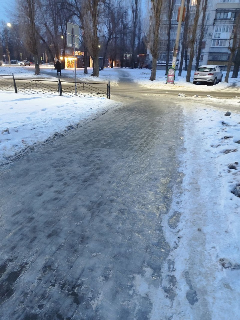 Особенно скользко у спуска в подземный пешеходник. Выглядит безобидно, но это идеально полированная ледяная поверхность.