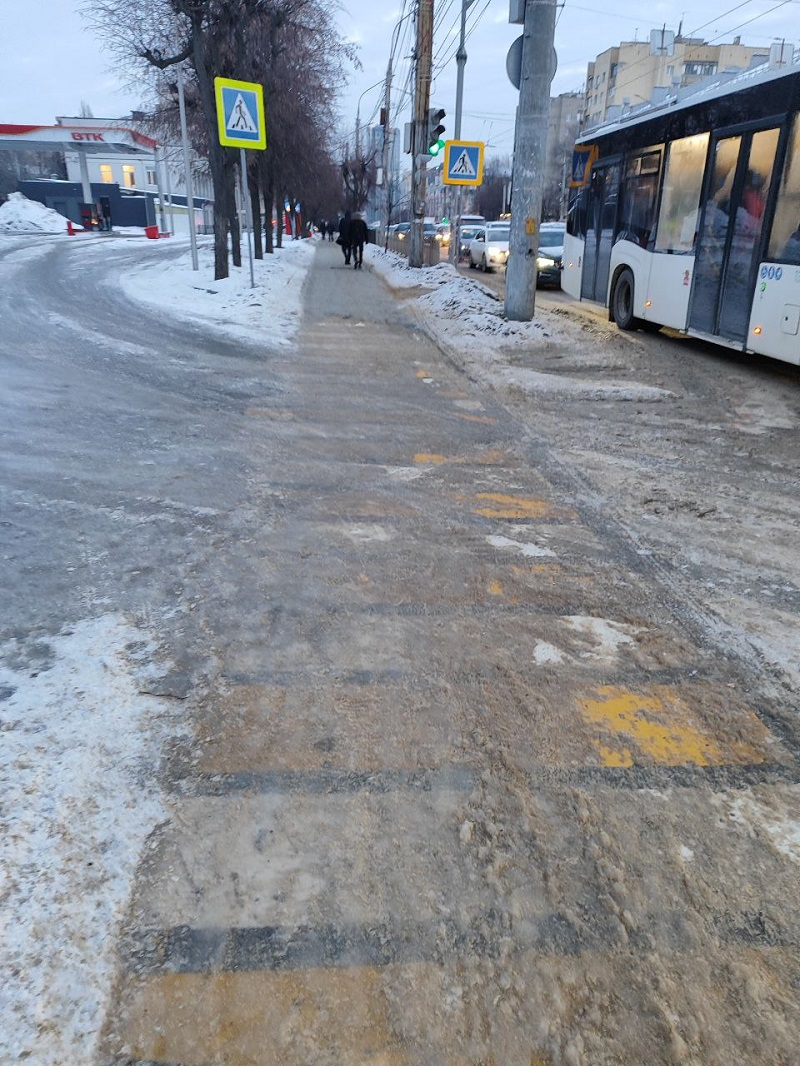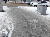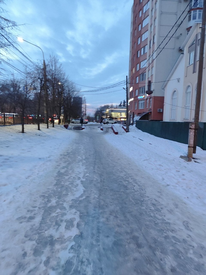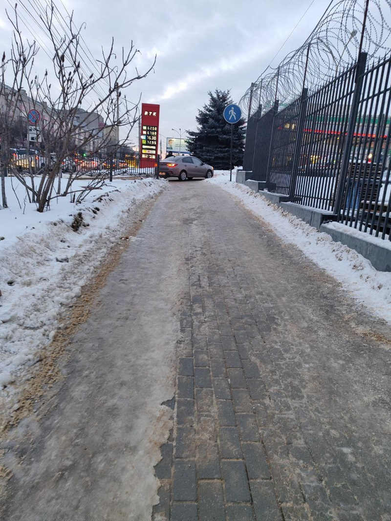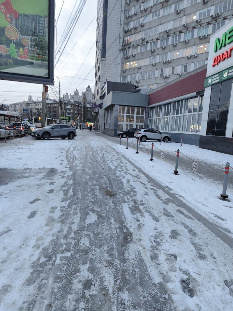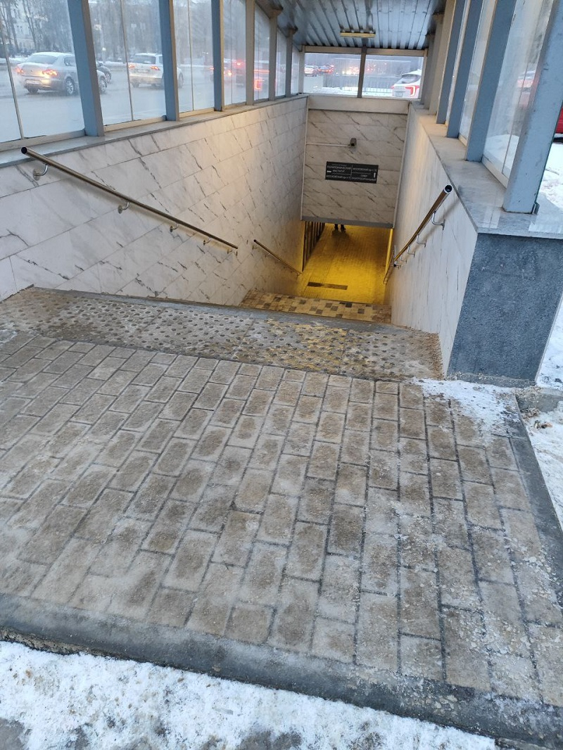 Особенно скользко у спуска в подземный пешеходник. Выглядит безобидно, но это идеально полированная ледяная поверхность.