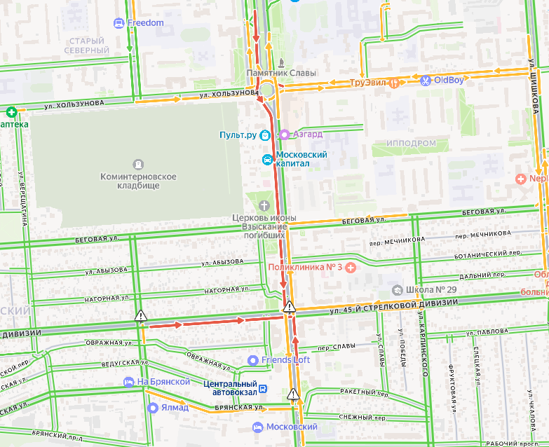 Судя по данным сервиса «Яндекс. Карты», затор на Московском проспекте растянулся в сторону центра почти на 1,5 километра. В обратном направлении придется постоять примерно 800 метров. На 45 Стрелковой Дивизии затор составляет около 500 метров по направлению к Шишкова и почти километр в противоположную сторону.