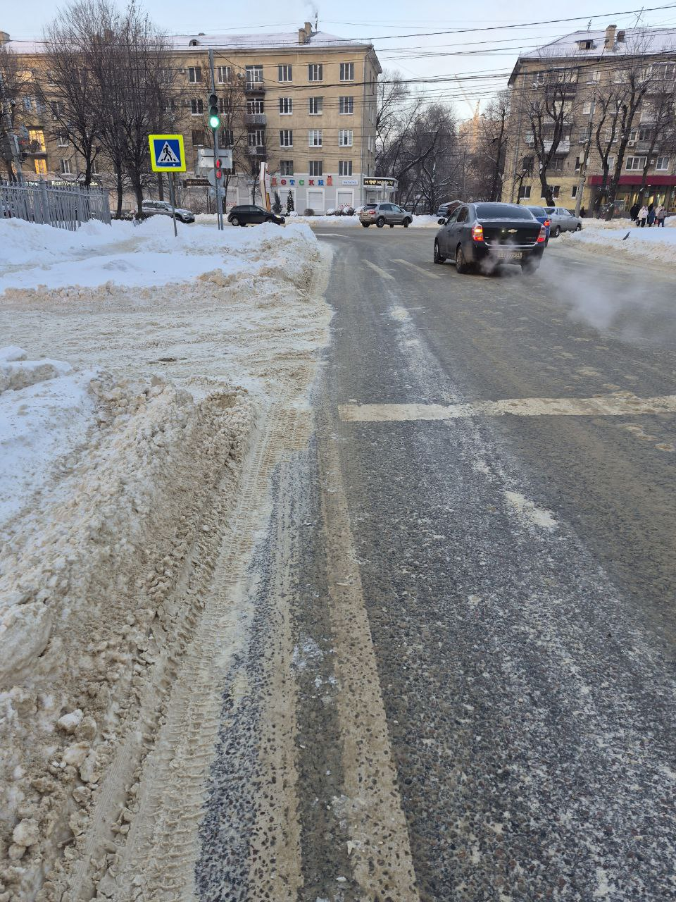 Несмотря на низкую температуру, комбинаты благоустройства продолжают убирать Воронеж от снега. Однако на некоторых участках до идеала еще далеко. Например, при повороте с Московского проспекта на улицу Урицкого автомобилистов ждет неприятный сюрприз в виде заснеженной полосы.