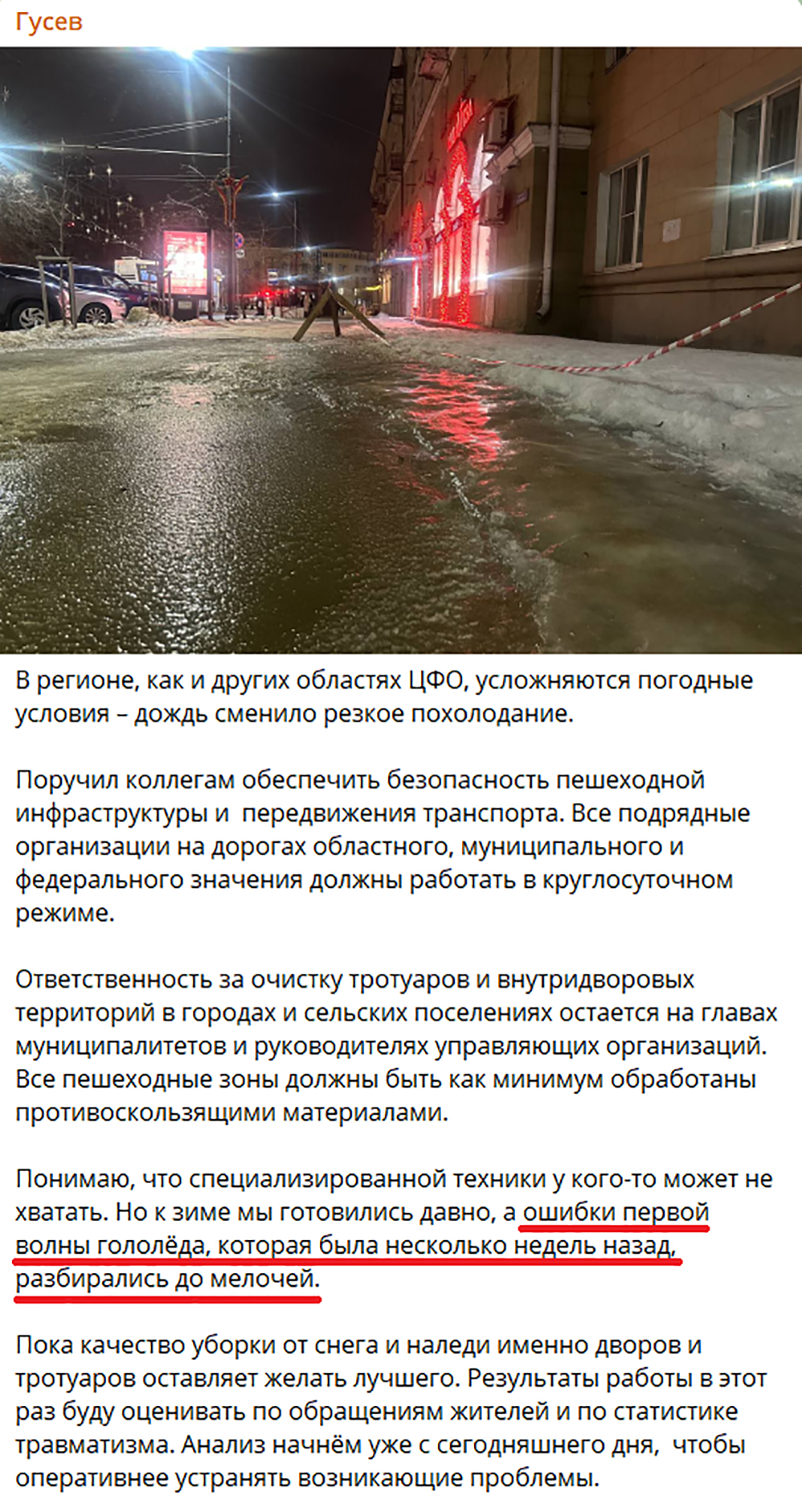Губернатор Гусев писал: «Ошибки первой волны гололёда, которая была несколько недель назад, разбирались до мелочей».