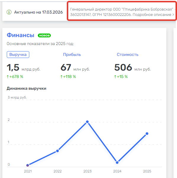 По неофициальной информации, в результате птичьего гриппа и ряда иных причин у ООО «Птицефабрики Бобровская» размер выручки в 2024 году сократился (по сравнению с предыдущим годом) почти в 10 раз, с 2 млрд рублей до 191 млн рублей, а размер прибыли уменьшился на 962 млн рублей; с 595 млн рублей до убытка в 367 млн рублей.
