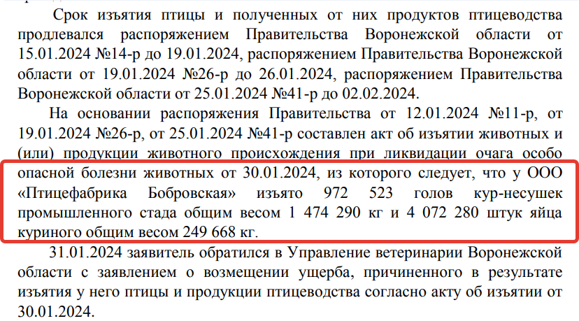 Истец требовал признать незаконным и подлежащим отмене распоряжение правительства Воронежской области (№158-р) от 01.03.2024 г. об отказе в возмещении ущерба, понесенного ООО «Птицефабрика Бобровская» в результате изъятия животных и продукции и продукции животного происхождения при ликвидации очага особо опасных болезней животных. В этом правительственном документе как раз говорилось об отказе в возмещении ущерба, понесенного ООО «Птицефабрика Бобровская».