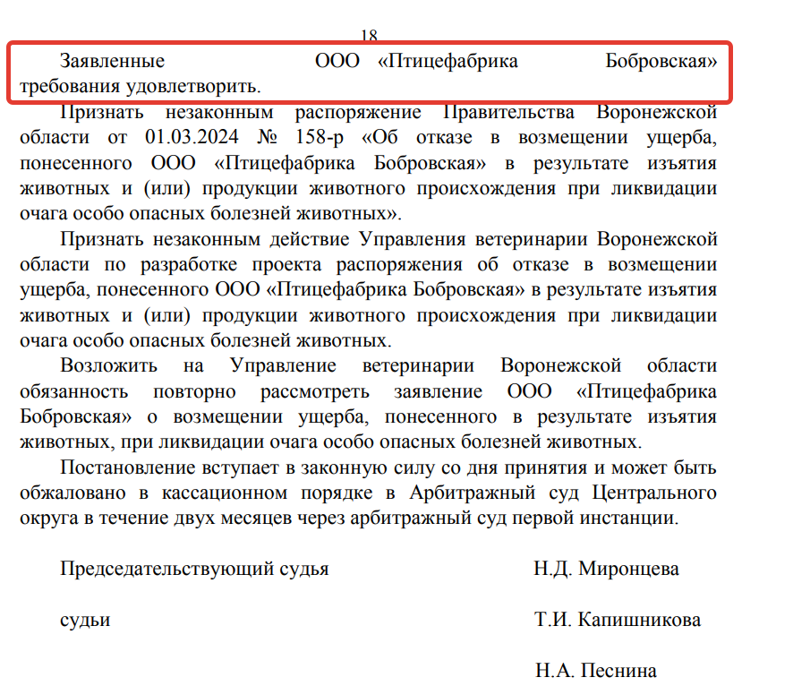 Остается открытым вопрос: будут ли региональные власти компенсировать потери ООО "Птицефабрика Бобровская", которые могут составить около 1,5 млрд рублей, из-за, как сказано в постановлении 19 Арбитражного апелляционного суда (см. скриншот №2), "незаконного распоряжения Правительства Воронежской области от 01.03.2024 №158-р "Об отказе в возмещении ущерба, понесенного ООО "Птицефабрика Бобровская в результате изъятия животных и продукции животного происхождения при ликвидации очага особо опасных болезней животных". Скорее всего, ответ на этот вопрос станет известным уже после очередного (третьего) рассмотрения дела в суде, на этот раз в Арбитражном суде Центрального округа.
