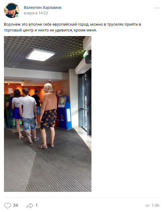 Внимание воронежца привлек внешний вид клиента банка. По словам Валентина, пожилой мужчина был одет в одни трусы.