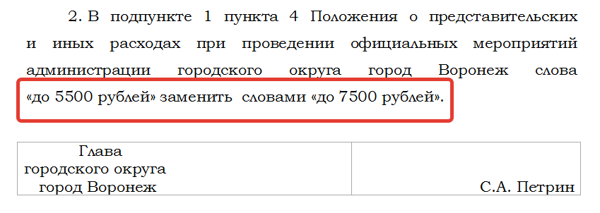 Почти на 40 процентов мэр Сергей Петрин увеличил затраты бюджета на представительские и иные расходы при проведении официальных мероприятий администрации городского округа город Воронеж. Норма представительских расходов увеличена (на одного человека) с прежних 5500 рублей до 7500 рублей. Об этом сообщается в постановлении городской администрации №39 от 22 января 2026 года, документ был официально опубликован накануне на сайте мэрии.